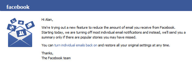 Esto es algo que ya se está llevando a cabo. Durante los últimos días Facebook ha enviado a algunos usuarios un correo electrónico en el que informa que se está probando una nueva característica con el objetivo de reducir la cantidad de emails que envían a sus usuarios.