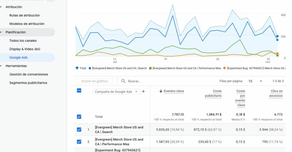La sección de Planificación en GA4 muestra los eventos clave y conversiones generadas por tus campañas. Aquí puedes analizar qué acciones están realizando los usuarios a partir de los anuncios y ver qué campañas están funcionando mejor.